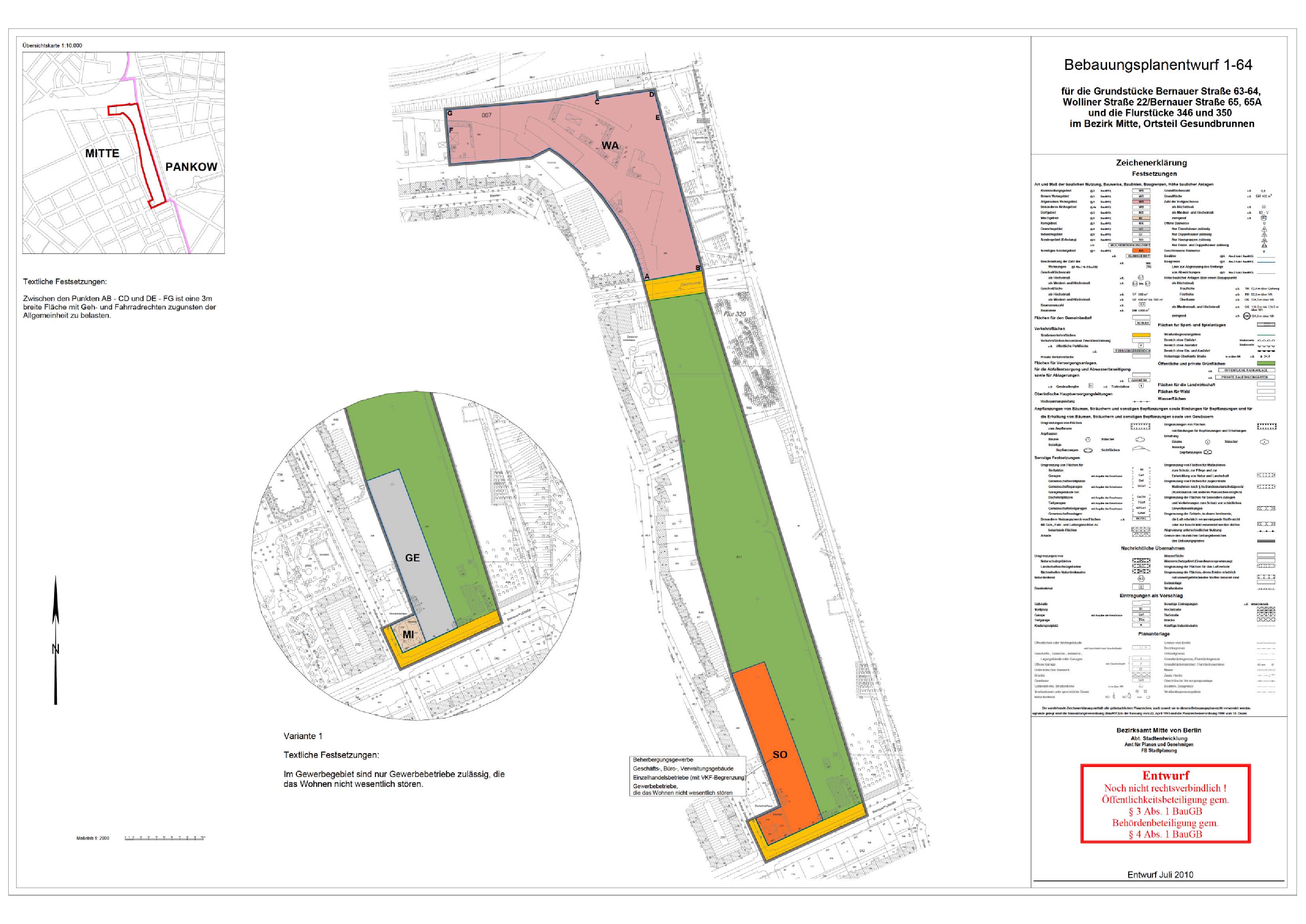 Die nördlich der Gleimstraße befindliche Baufläche soll als allgemeines Wohngebiet und die an der Bernauer Straße gelegene Baufläche als Sondergebiet oder Gewerbegebiet für ein park- und wohnverträgliches Nutzungsspektrum wie z.B. für Hotel, Büro, Einzelhandel etc., die jedoch im weiteren Verfahrensablauf noch näher bestimmt werden müssen, entwickelt werden. Für das Eckgrundstück Wolliner Straße/Bernauer Straße ist auch eine Wohnnutzung in die Planungsüberlegungen einzubeziehen.“