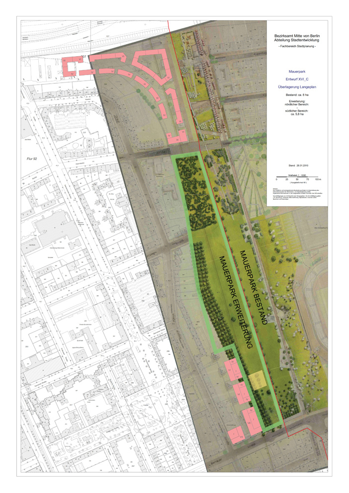 „Zwischen dem Eigentümer des Grundstücks des ehemaligen Güterbahnhofs der Nordbahn und der Abteilung Stadtentwicklung des Bezirksamtes Mitte, konnte nach langen Verhandlungen eine grundsätzliche Verständigung zur weiteren städtebaulichen Entwicklung des betroffenen Geländes erzielt werden. Danach ist eine Fläche von ca. 5,8 ha im Bereich zwischen der Bernauer Straße und der Gleimstraße für die Fertigstellung des Mauerparks vorgesehen. Dieser wird somit zukünftig statt der bisher fertig gestellten, im Bezirk Pankow liegend Fläche von da. 7,5 ha, eine Gesamtfläche von 13,3 ha umfassen. Städtebauliches Ziel ist u. a. auch, den Park zukünftig zusätzlich der Gleimstraße her zu erschließen.